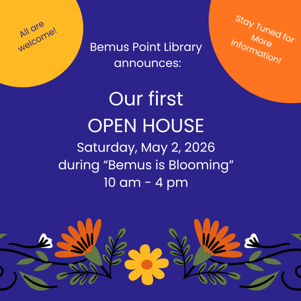 Please join us for Bemus Point Library’s first Open House on Saturday, May 2, 2026, from 10 AM – 4 PM, during “Bemus is Blooming” Village celebration!