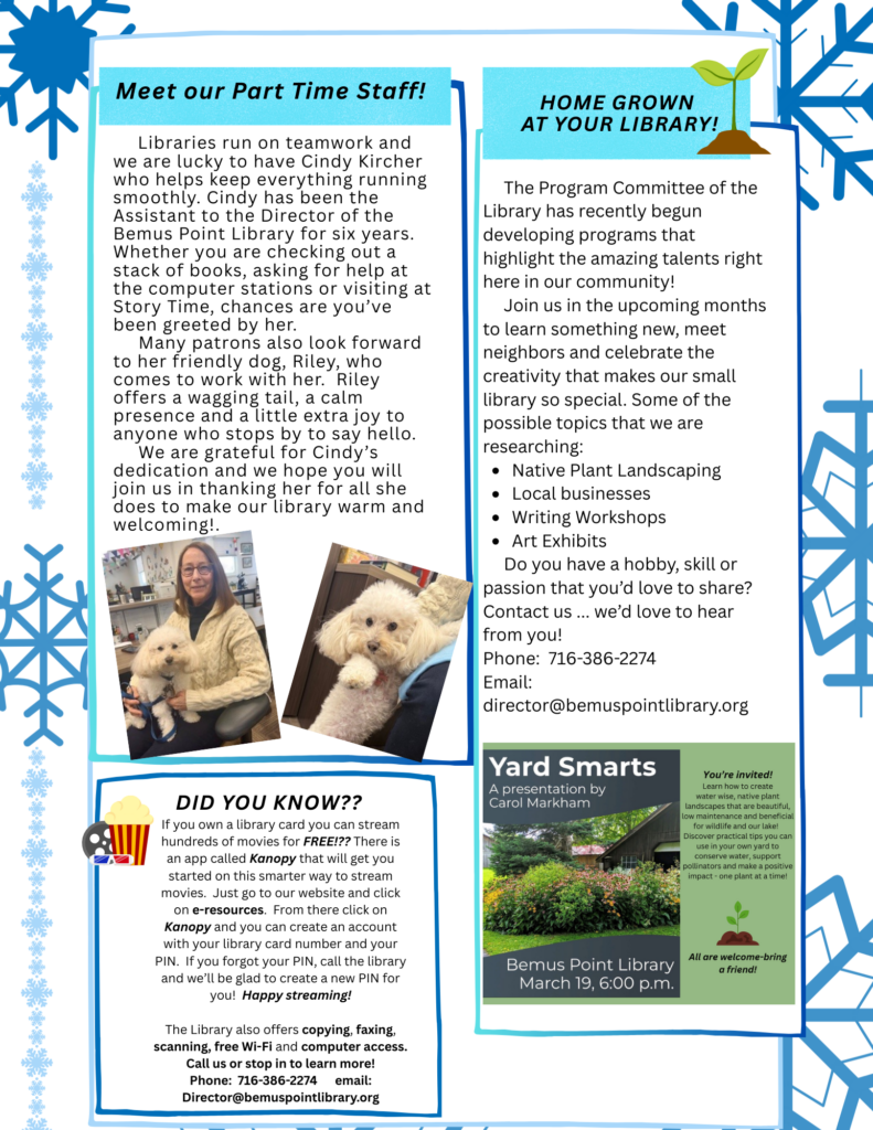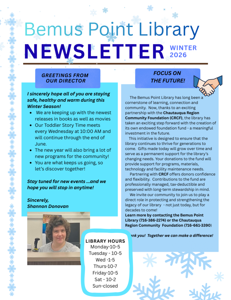 If you would like to receive our quarterly newsletter, call the library (716-386-2274) to add your email to our patron list.